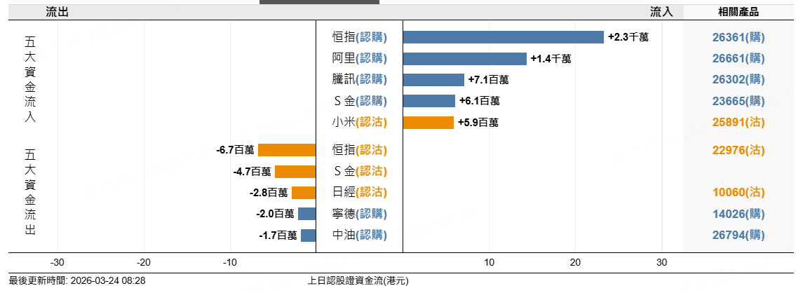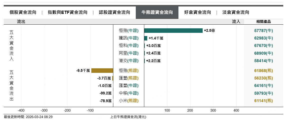 恒指牛證上日淨流入2.5億元,騰訊牛證淨流入1400萬元,恆科牛證淨流入300萬元;