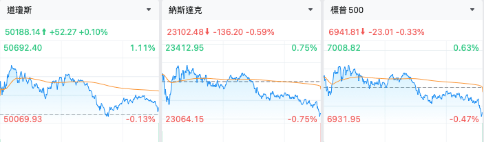截至收盘,道琼斯指数涨0.10%,报50,188.14点;标普500指数跌0.33%,报6,941.81点;纳斯达克指数跌0.59%,报23,102.47点。
