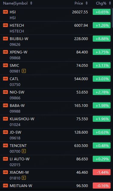 In terms of star stocks, Bilibili up 9%; SMIC, CATL, Nio up 3%; Alibaba, Kuaishou up 2%; Tencent rose 0.5%; Xiaomi fell 1.4%.
