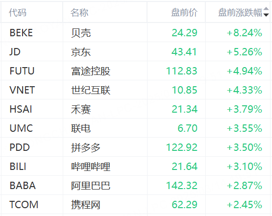 中概股盘前多数走高,截至发稿 贝壳 大涨超8%, 京东 涨超5%, 阿里巴巴 涨近3%;