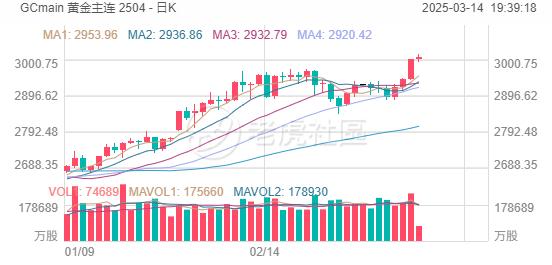 金价周五首次突破每盎司3,000美元的心理关口,延续历史性涨势,因贸易紧张局势和美国降息押注增强了黄金作为避险资产的吸引力,截至发稿 黄金主连 2504 报3007.9美元,涨幅0.55%: