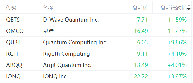 量子计算概念持续走高, 昆腾 、 D-Wave Quantum Inc. 均涨超11%, Quantum Computing Inc. 涨近10%: