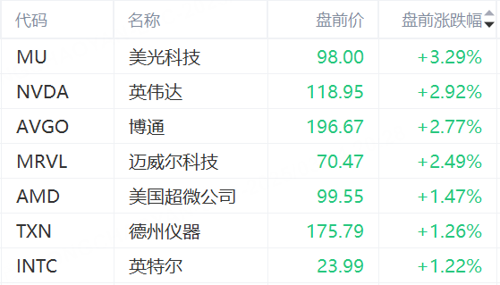 芯片股普涨, 美光科技 涨超3%,博通 、英伟达 涨近3%, 迈威尔科技 涨超2%: