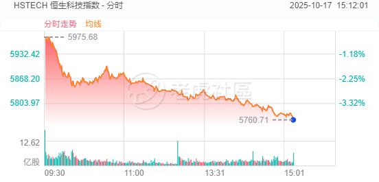 10月17日,港股午后持续走低,恒生科技指数跌幅扩大至4%,恒指跌2.5%。