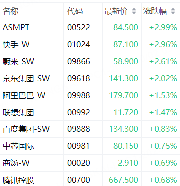 科指成分股中,ASMPT涨2.99%,快手-W涨2.96%,蔚来-SW涨2.61%,京东集团-SW涨2.02%。