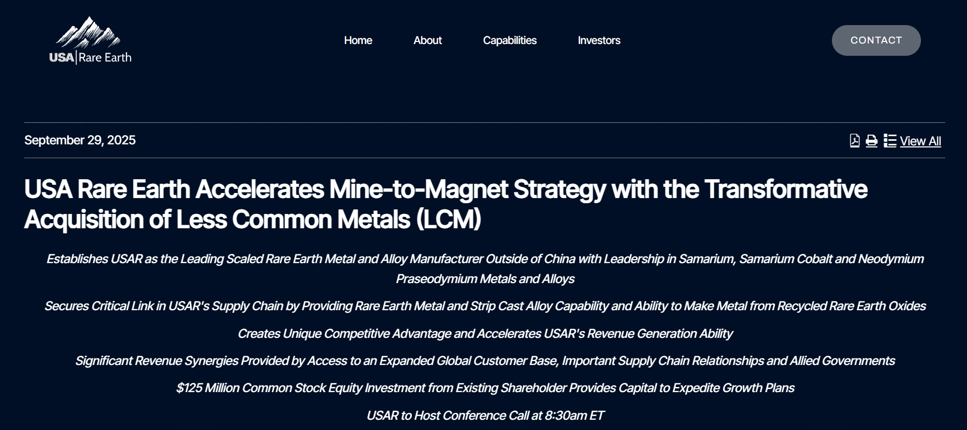USA Rare Earth拟收购稀土金属制造商LCM公司