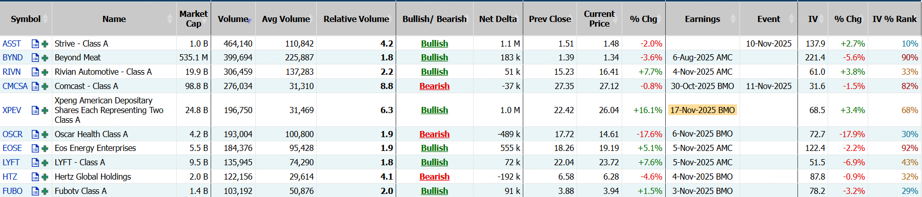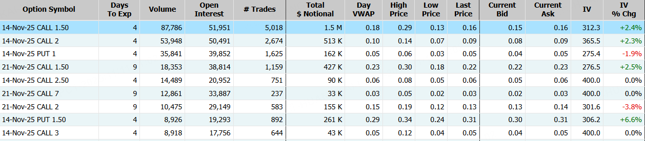 美股“人造肉第一股”Beyond Meat隔夜跌超3%,盘后再度下挫超8%。期权合约成交39.97万张,较90日均量放大1.8倍。11月14日到期的1.5美元的行权看涨期权交易量特别高,共有87,786份合约交易。 $BYND 20251114 1.5 CALL$