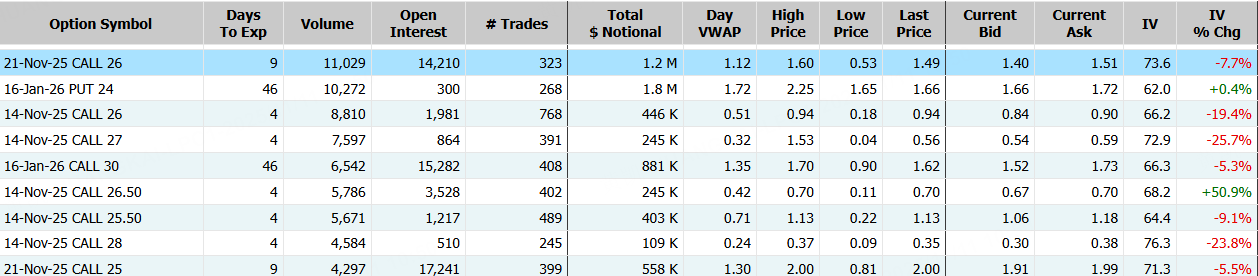 小鹏汽车隔夜涨超16%,期权合约成交19.68万张,较90日均量放大6.3倍。11月21日到期的26美元的行权看涨期权交易量特别高,共有11,029份合约交易。 $XPEV 20251121 26.0 CALL$