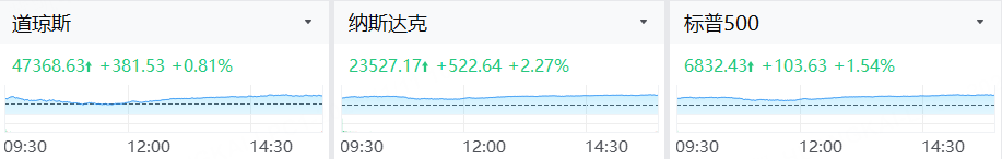 美东时间周一,美股三大指数集体收涨。截至收盘,道指涨381.53点,涨幅为0.81%,报47368.63点;纳指涨522.64点,涨幅为2.27%,报23527.17点;标普500指数涨103.63点,涨幅为1.54%,报6832.43点。