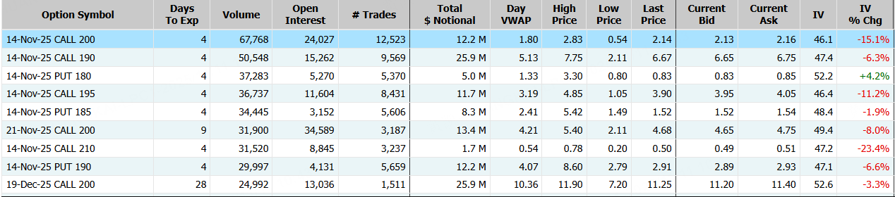 期权方面,英伟达期权合约成交260.87万张,11月14日到期的200美元的行权看涨期权交易量特别高,共有221,670份合约交易。 $NVDA 20251114 200.0 CALL$