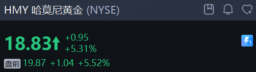 现货黄金涨1%,黄金股盘前普涨。截至发稿, 哈莫尼黄金 涨超5%,科尔黛伦矿业涨超3%,金田、金罗斯黄金、 AngloGold Ashanti Ltd ADS 涨超2%。