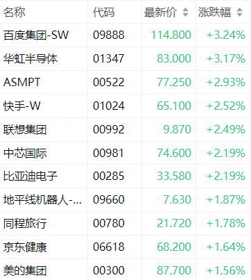科指成分股中,百度集团-SW涨3.24%,华虹半导体涨3.17%,ASMPT涨2.93%,快手-W涨2.52%,联想集团涨2.49%。中芯国际、比亚迪电子涨2.19%。