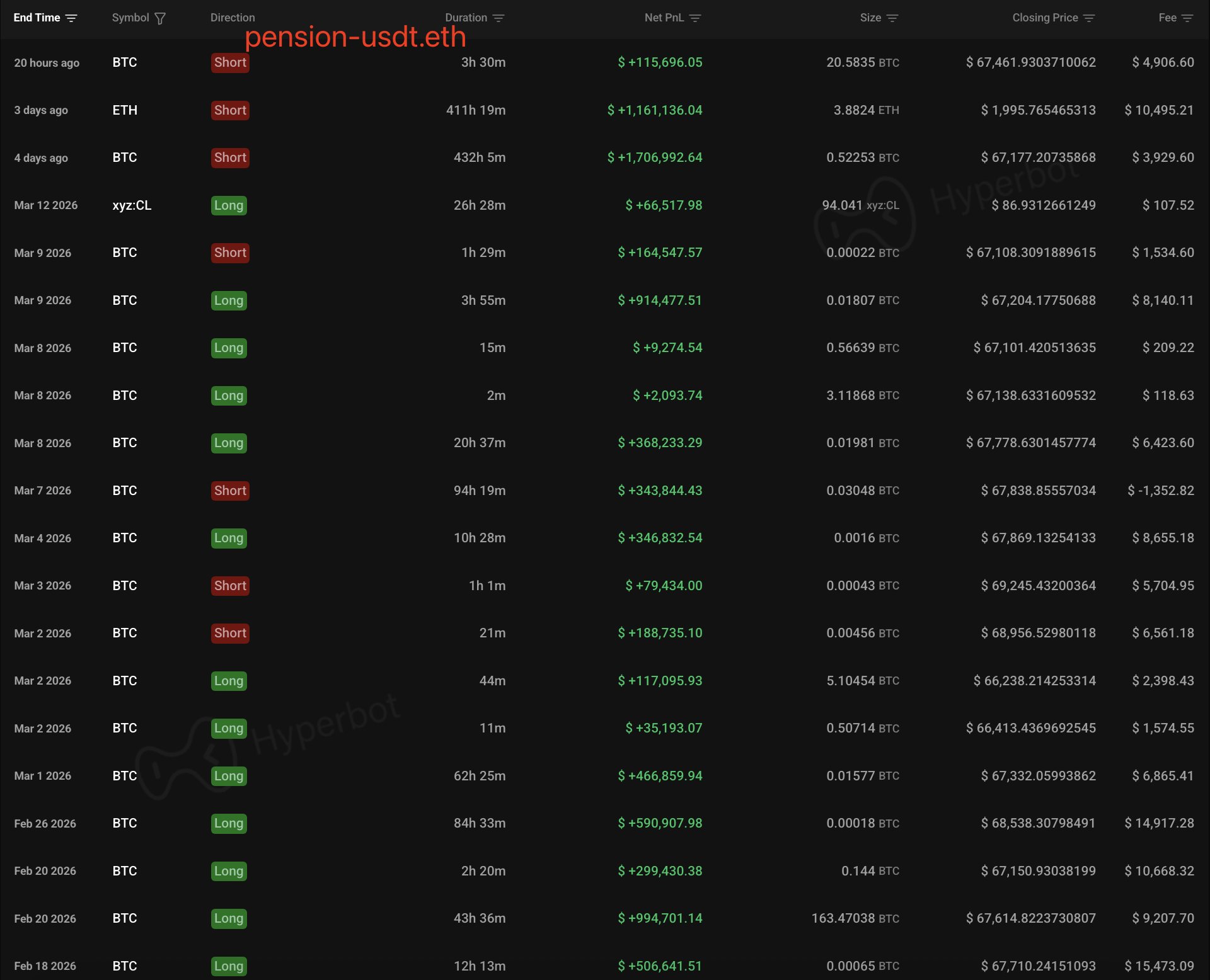 4月1日,据Lookonchain监测,波段巨鲸“pension-usdt.eth”自2月18日以来连续20次交易获胜,累计盈利达3046万美元。该交易员今日再度出手,以3倍杠杆开立500枚BTC(名义价值约3390万美元)空头头寸。