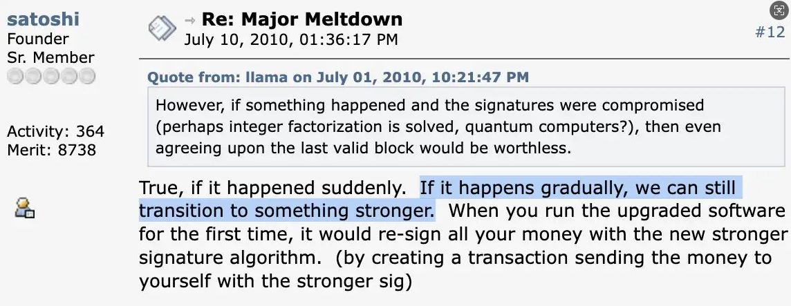 中本聪曾于2010年在一篇论坛帖子中谈论量子计算,针对量子计算可能破解签名算法的风险,他表示若这种情况是逐步发生的,可通过升级软件过渡到更安全的签名方案。用户首次运行升级后的软件时,可用新的签名算法重新签署所有资产(即创建一笔将资产发送给自己的交易,并使用更强的签名)。