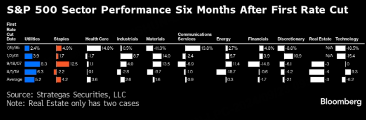 Strategas的数据显示,从这四个周期中首次降息后的六个月来看,表现最好的板块是公用事业,平均上涨5.2%。表现最差的是科技板块,平均下跌6.2%,房地产、非必需消费品和金融板块也跌幅居前。