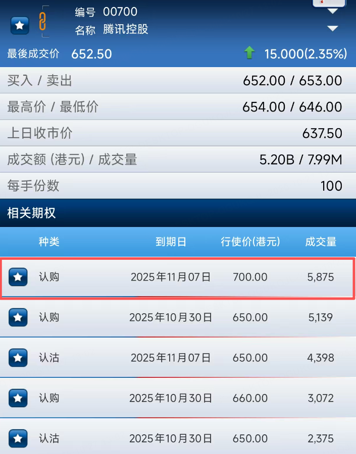 期权方面,腾讯上午排名第一的认购期权,到期日为11月7日,行权价700港元,较现价有8%左右的涨幅空间。