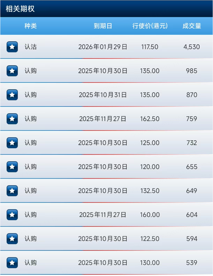 百度上午的前十大期权成交中,九份都是认购合约。其中一份11月27日到期的CALL,行权价高达162.5港元,较现价有30%左右的涨幅空间。百度在AI概念上的领先身位,或许能够成为股价的巨大助力。