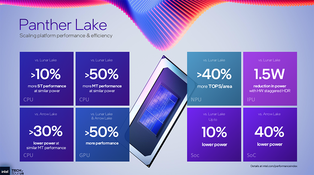 相比上一代,Panther Lake实现图形性能提升50%,每瓦性能提升40%。