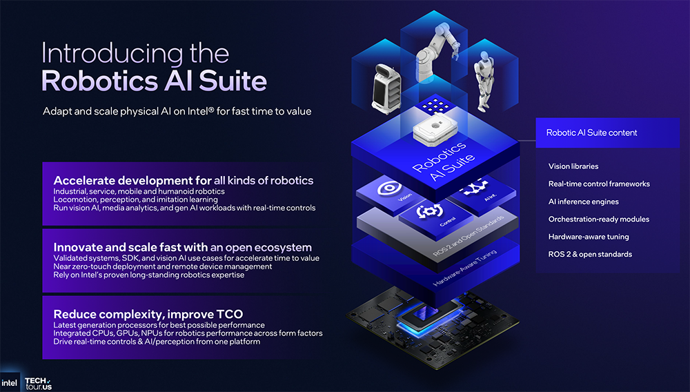 英特尔全新机器人AI套件是一个开发工具包,与英特尔酷睿处理器完全集成,提供主流机器人模型、多样的参考应用、流媒体分析管线、先进AI算法、视觉语言模型优化,以加速机器人开发和部署。