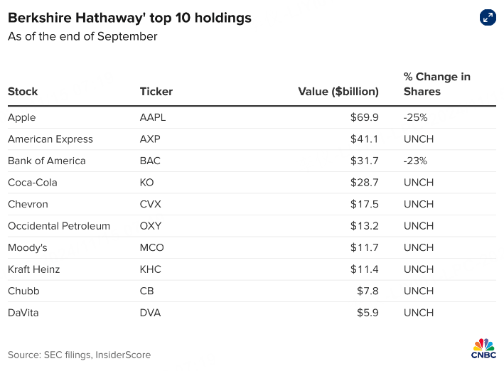 伯克希尔出售了其主要持股——苹果和美国银行的部分股份,这些变动之前已经披露过了。上个季度,伯克希尔的大多数重要持股没有发生变化。
