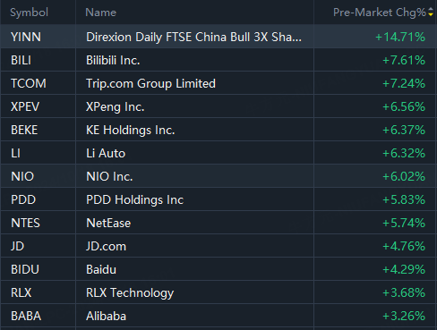 YINN rose 15%; Bilibili rose 8%; XPeng rose 7%; Nio, Li Auto rose 6%; PDD Holdings rose 5.8%; JD.com rose 5%; Baidu rose 4.3%; Alibaba rose 3.3%.