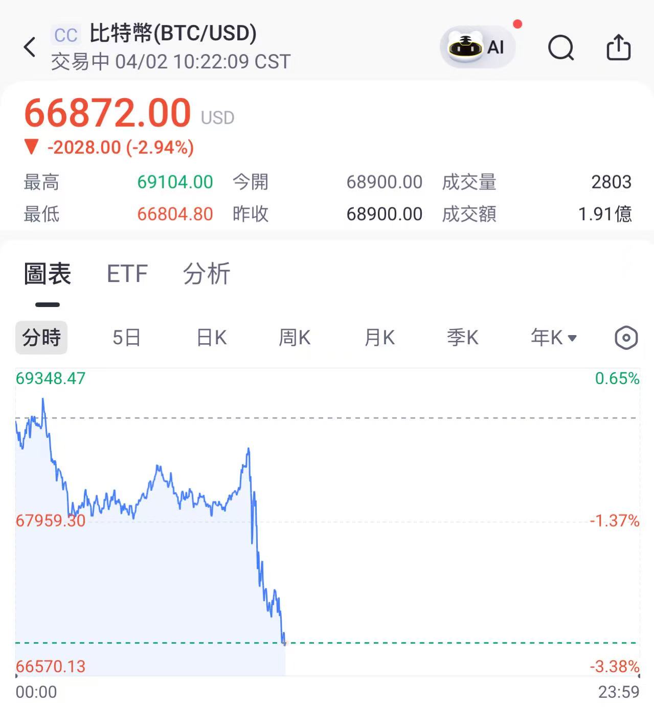 比特币跌近3%,跌破67000美元。