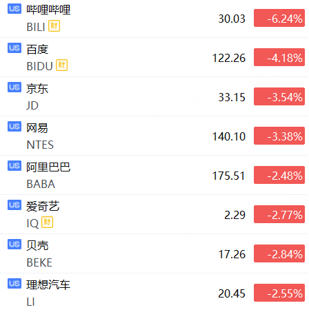 10月30日,部分中概股盘初震荡下行,哔哩哔哩跌超6%,百度跌超4%,网易、京东跌超3%,阿里巴巴、理想汽车、爱奇艺、贝壳跌超2%