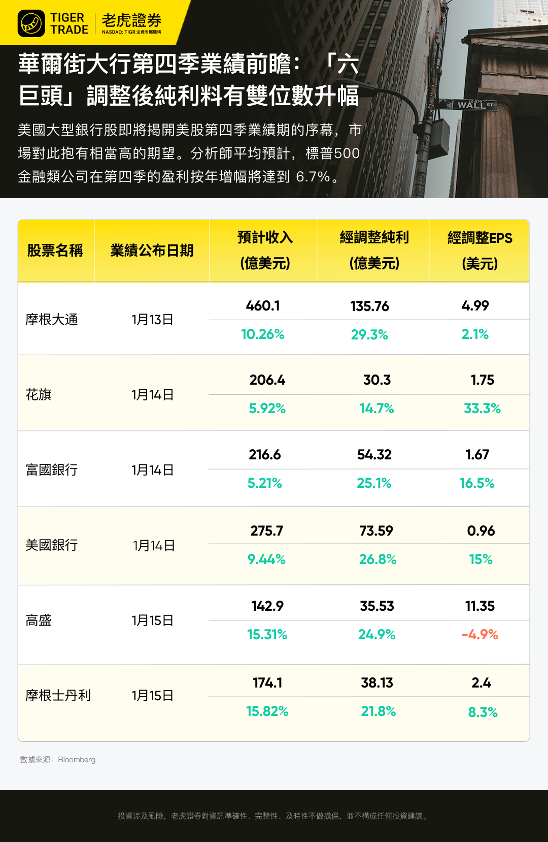 一圖睇明 | 華爾街大行第四季業績前瞻:「六巨頭」調整後純利料有雙位數升幅