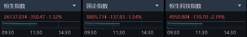 4月22日,美伊谈判无期,地缘风险持续压制情绪。港股上午盘三大指数低开低走,恒生科技指数跌幅较大,午间收跌2.19%,恒生指数、国企指数分别下跌1.32%及1.54%。