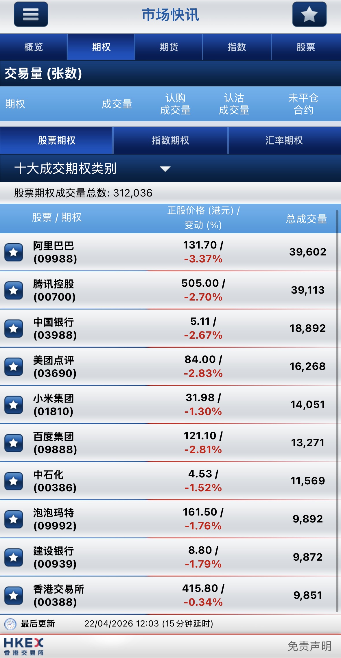 截止午间收盘,港股期权半日成交超31万张,其中,阿里巴巴-W成交量居首,期权成交近4万张;腾讯控股名列次席,期权成交超3.9万张;中国银行位居第三,期权成交近1.9万张。