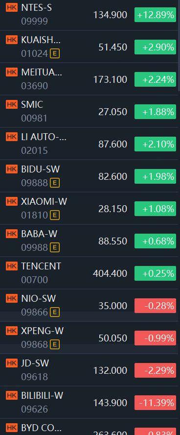 Kuaishou rose 3%; Meituan, Li Auto, Baidu, and SMIC rose 2%; Xiaomi rose 1%; XPeng fell 1%; JD.com fell 2%; Bilibili fell 11%.
