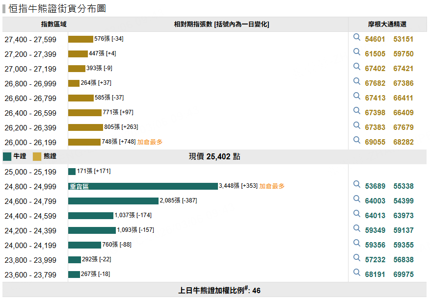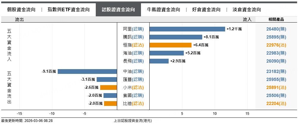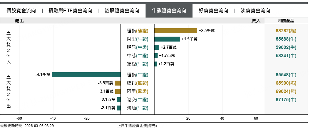 恒指熊證上日淨流入2500萬元,阿里牛證淨流入1500萬元;