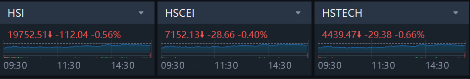 Hong Kong stock market closed lower. The Hang Seng Index fell by 0.56%, the Hang Seng China Enterprises Index decreased by 0.40%, the Hang Seng Tech Index dropped by 0.66%, and the Hang Seng China-Affiliated Corporations Index declined by 0.69%.