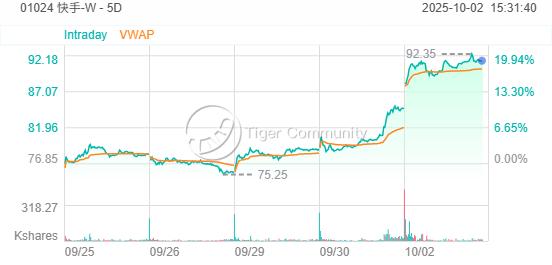 快手周四(2日)飙8%,高见92.6,成交62亿港元。