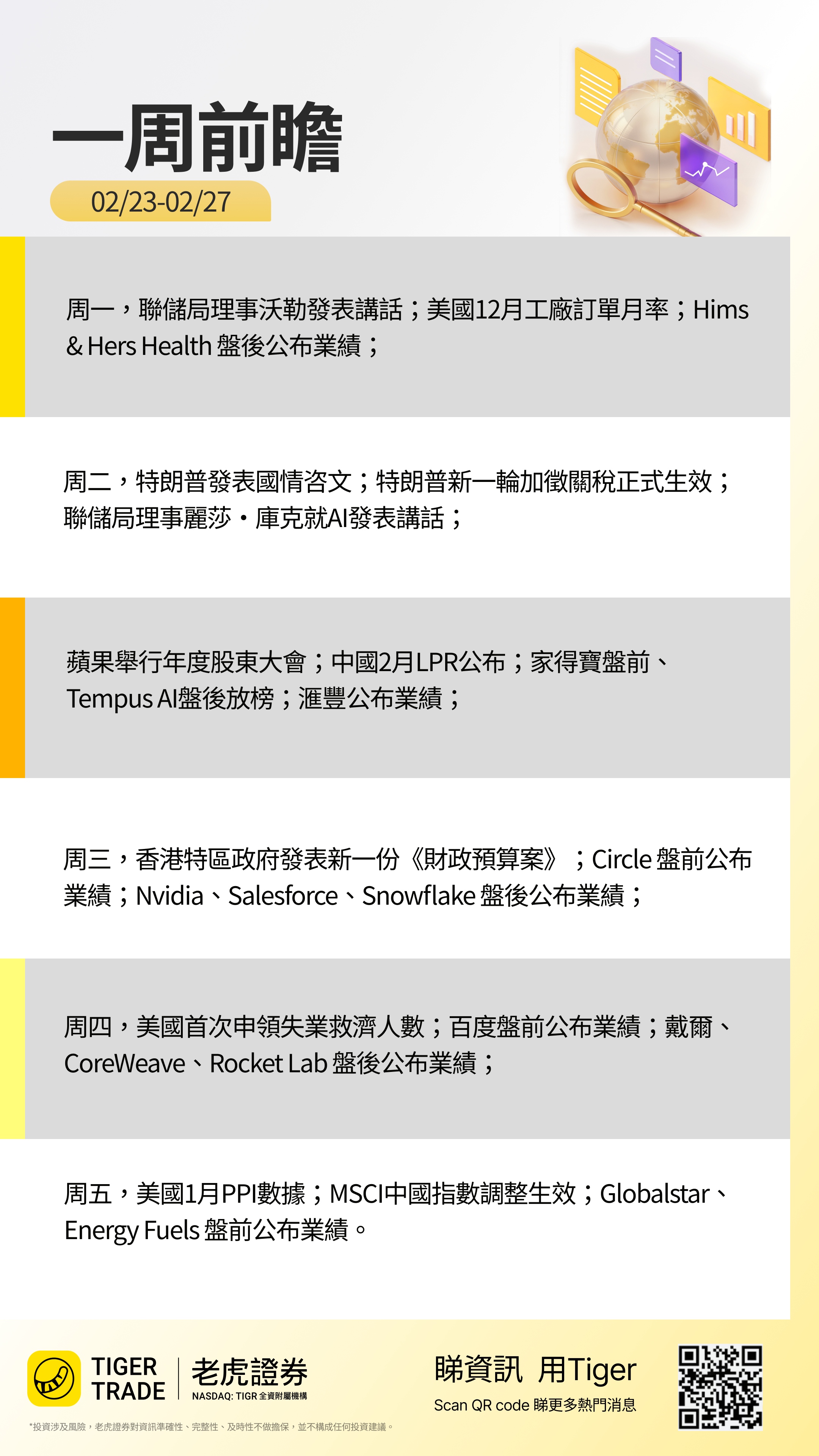 财经事件:特朗普发表国情咨文;特朗普新加征关税税率生效;中国香港新一份财政预算案发表;MSCI中国指数调整生效;苹果举行年度股东大会;