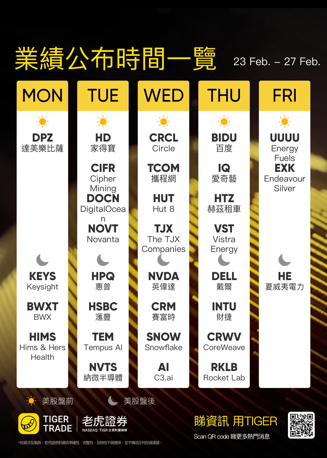 此外, 赛富时、Snowflake、Hims & Hers Health 、 渣打集团、 Tempus AI、 汇丰控股、 Circle、 香港交易所、 百度、 CoreWeave、 Rocket Lab 等公司也将于本周公布业绩。