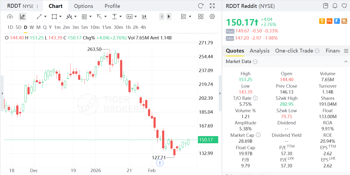 然而,过去五周(截至2026年2月下旬),Reddit股价累计下跌42%,从高位大幅回落。目前股价徘徊在150美元附近,2026年迄今累计跌幅已超35%。这一调整引发美股投资者关注,尤其在社交媒体板块整体承压的背景下。