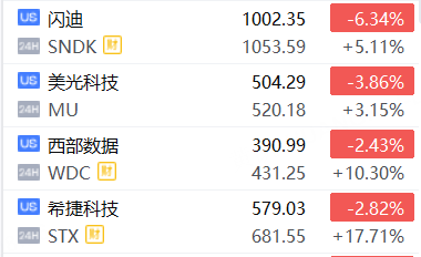 4月29日,美股夜盘时段,美股存储概念普涨,希捷科技绩后大涨17%,西部数据涨超10%,闪迪涨超5%,美光科技涨超3%;