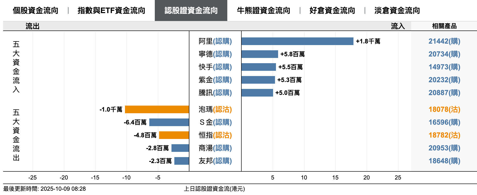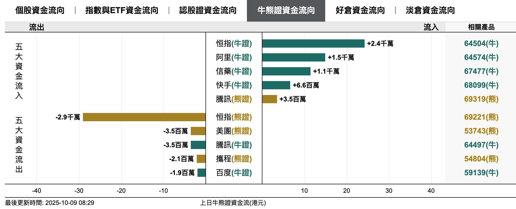 恒指牛證上日淨流入2400萬元,阿里牛證淨流入1500萬元,信藥牛證淨流入110萬元;