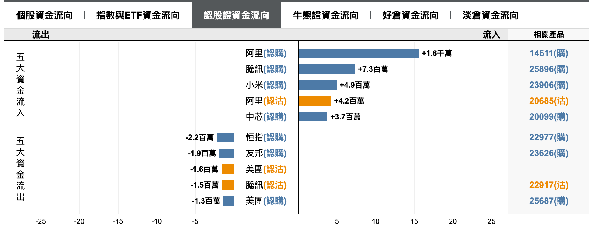 騰訊牛證上日淨流入370萬元,阿里牛證淨流入240萬元,泡瑪熊證淨流入190萬元;
