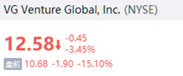 Venture Global跌超15%,公司在英国石油公司液化天然气仲裁案中败诉。