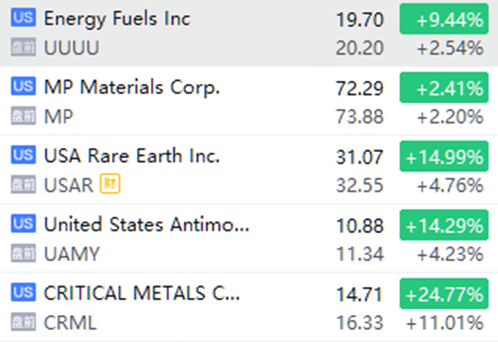 稀土概念股盘前继续活跃,Critical Metals涨超11%,USA Rare Earth、United States Antimony涨超4%,MP Materials、Energy Fuels涨约2%。