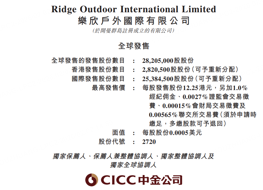 1月31日,乐欣户外发布公告,于1月31日至2月5日招股,公司拟全球发售2820.5万股,每股发售价11.25-12.25港元,每手500股,入场费6186.78港元,中金公司为独家保荐人,预计将于2月10日开始在港交所挂牌交易。