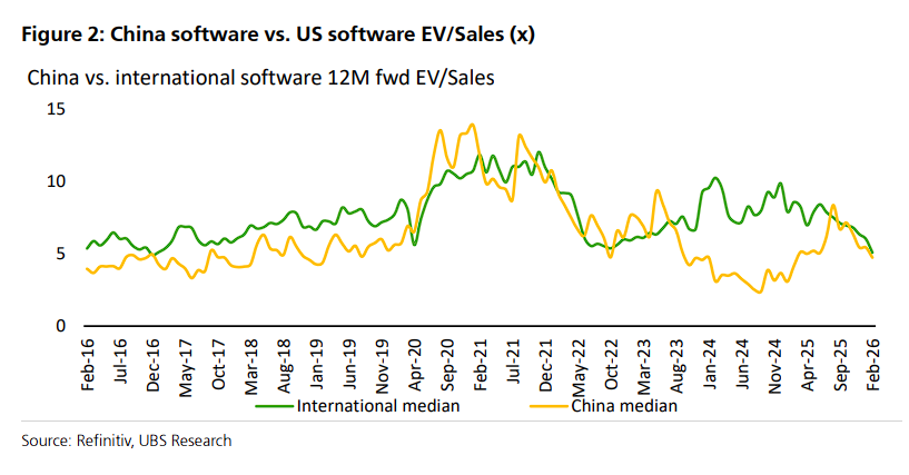 瑞银表示,中国软件行业的估值体系正被迫与SaaS解绑,向传统的IT服务估值回归——这意味着市盈率(P/E)或自由现金流(EV/FCF)将取代市销率成为新的定价锚。