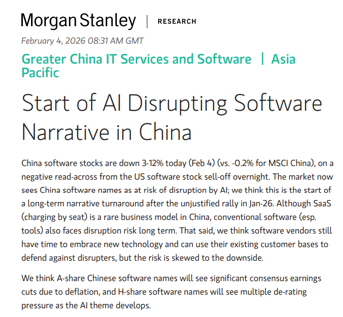 无独有偶,2月4日,摩根士丹利也在研报中指出,这是一个长期叙事转变的开端,结束2026年1月该板块不合理的上涨行情。尽管按席位收费的SaaS模式在中国并不普遍,但传统软件(尤其是工具类软件)长期来看同样面临颠覆风险。