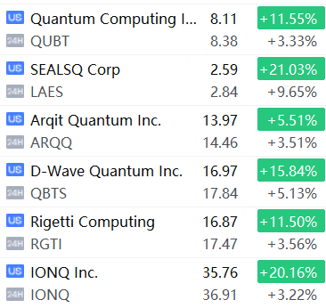 4月15日,美股夜盘时段,量子计算股延续涨势,SEALSQ涨超9%,D-Wave Quantum Inc.涨超5%, Arqit Quantum、Quantum Computing、IONQ Inc.涨超3%