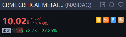 CRITICAL METALS CORPORATION 盘前快速拉升大涨超27%。据悉,CRITICAL METALS已与Realloys Inc签署了一项为期10年的供应协议。根据协议,CRITICAL METALS将向Realloys提供其Tanbreez项目15%的稀土精矿产量。这一长期协议不仅为Critical Metals提供了稳定的收入来源,也显示了市场对其产品的强劲需求,进一步增强了投资者对公司未来发展前景的信心。
