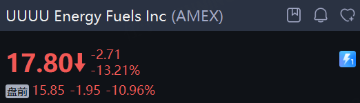 稀土公司 Energy Fuels Inc 大跌超10%,Q3净亏损为1673.6万美元,高于去年同期的1206万美元。