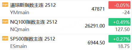10月29日,美股三大股指期货涨跌不一,截止发稿,道指期货跌0.05%,纳指期货涨0.49%,标普500指数期货涨0.27%。