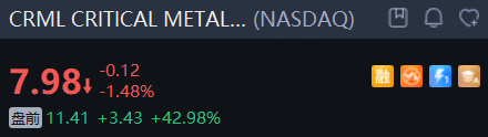 CRITICAL METALS CORPORATION 一度飙升超90%,现涨43%。消息称特朗普政府计划入股该公司,以便控制稀土资源。同时,相关概念股普涨,截至发稿,NioCorp Developments涨超17%,American Resources涨超13%,USA Rare Earth涨超5%,Energy Fuels涨超3%。